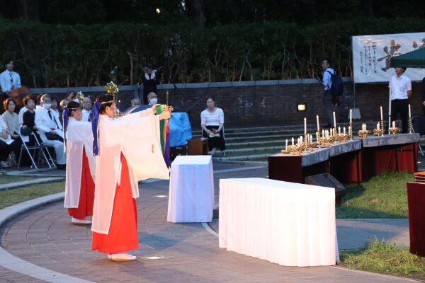 式典は、神職によるお清めから始まり、僧侶による読経と平和の誓いへと続きました。巫女による舞が奉納されると、参列者は静かにその祈りを見守り、宗教を超えて平和への思いを一つにしました。最後には、会場全体が静謐な空気に包まれる中で黙祷が捧げられ、原爆で命を落とされた多くの御霊に思いを馳せるひとときとなりました。