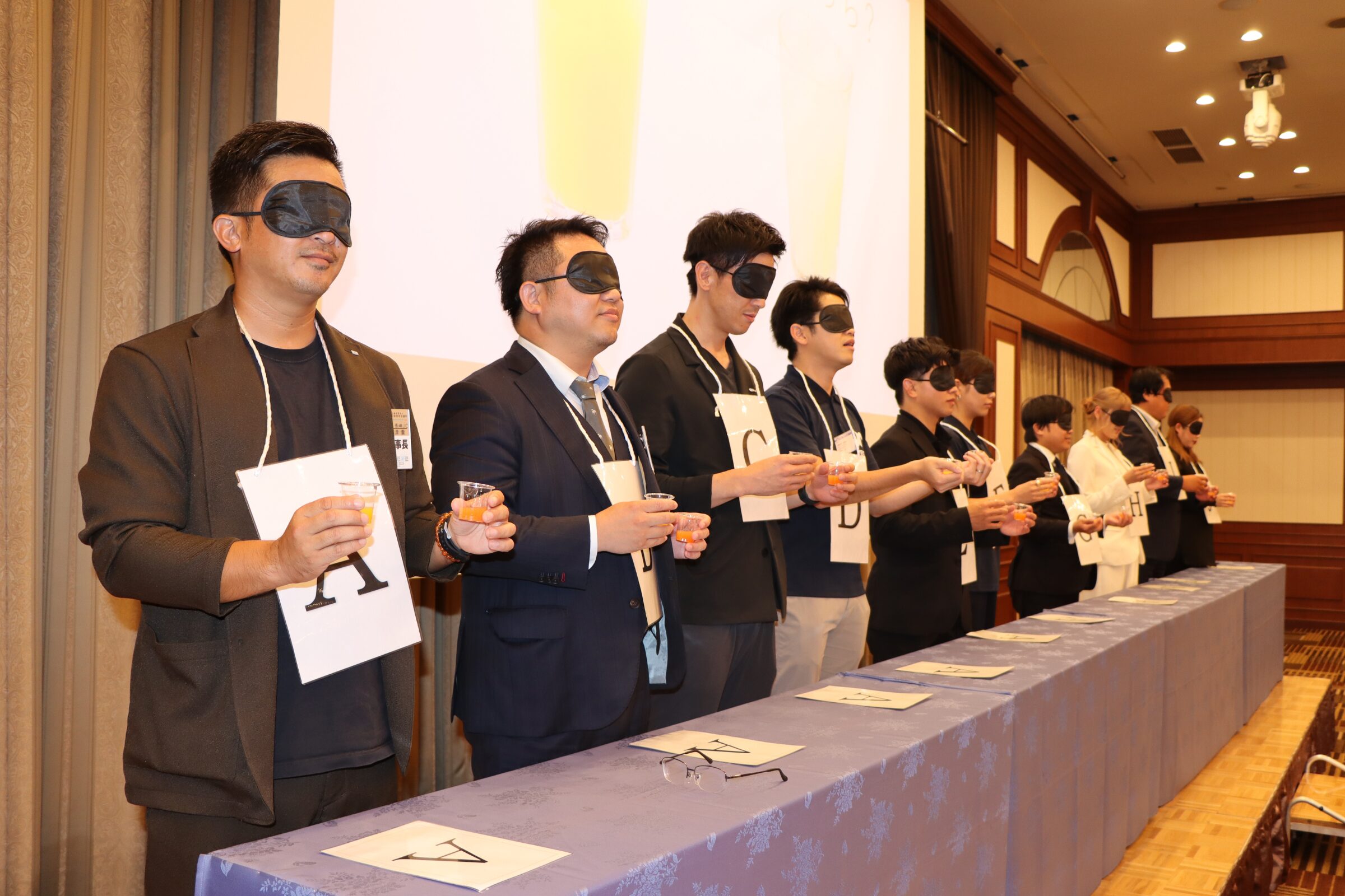 余興では、目隠しをした状態で、水やお茶など様々な飲み物を味わい、味や種類を当てる「利き〇〇」大会が行われました。