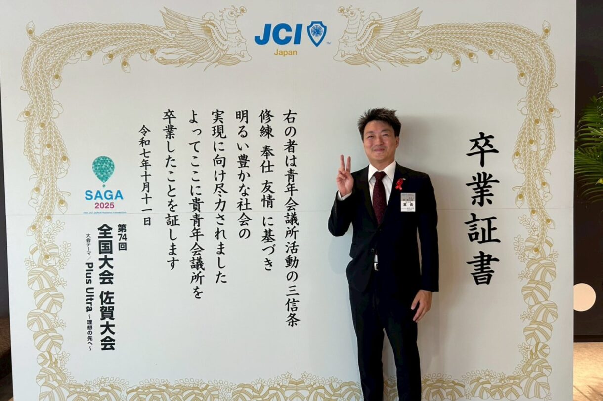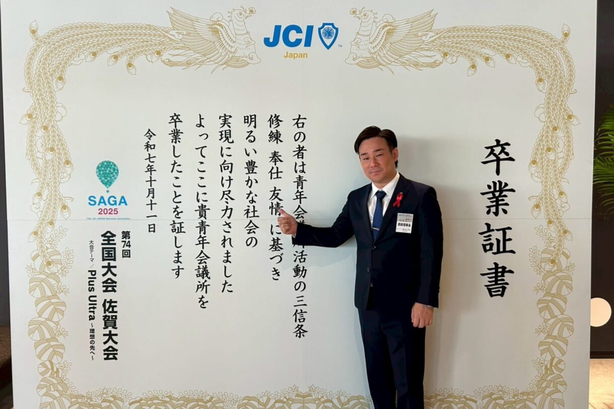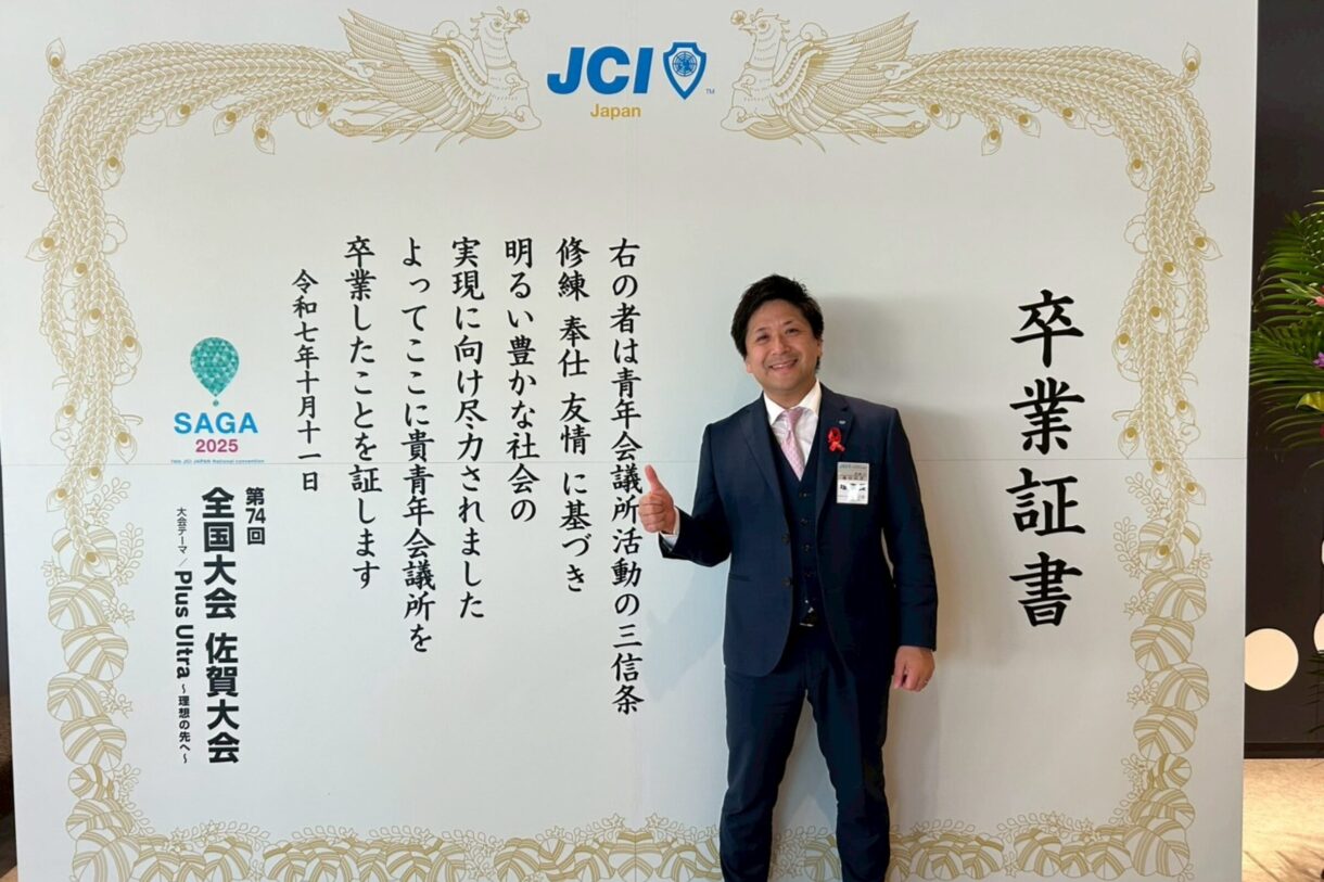 大会式典では、一年間の活動・運動の成果が共有され、日本JC 2025年度 第74代会頭 外口 真大君が本年度の運動を総括するスピーチを行いました。