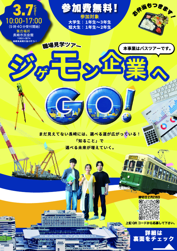 3月7日(土)、長崎市近郊の大学生1年生~3年生、短大生1年生~2年生を対象に、バスツアー「職場見学ツアー ジゲモン企業へGO!!」を開催します。長崎市は、人口減少が課題となっており、特に若い世代(※18歳~23歳とする)の転出超過は全国でも高い水準です。これから就職活動を始める大学生・短大生への地元産業の認知不足などが転出の要因となっています。企業と若い世代を繋げることで未来ある人財に地場企業が地域づくりや地域経済の活性化に寄与していることを知っていただき、自分自身も地域活性化を担う一員になりたいと思えるよう職場見学ツアーを実施致します。